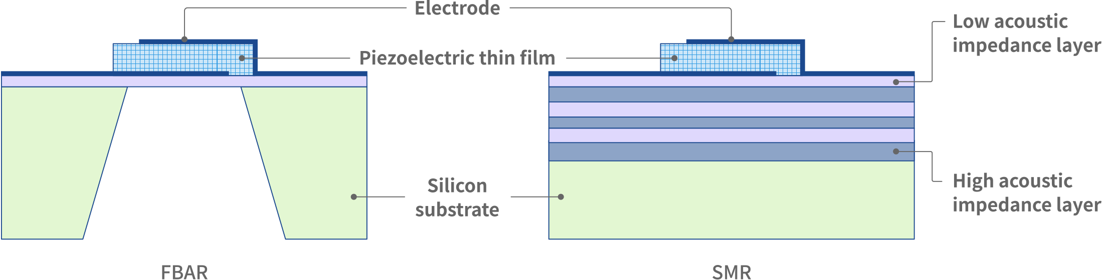 BAW器件包括FBAR(Film Bulk Acoustic Resonator)和SMR(Solidly-Mounted Resonator)。