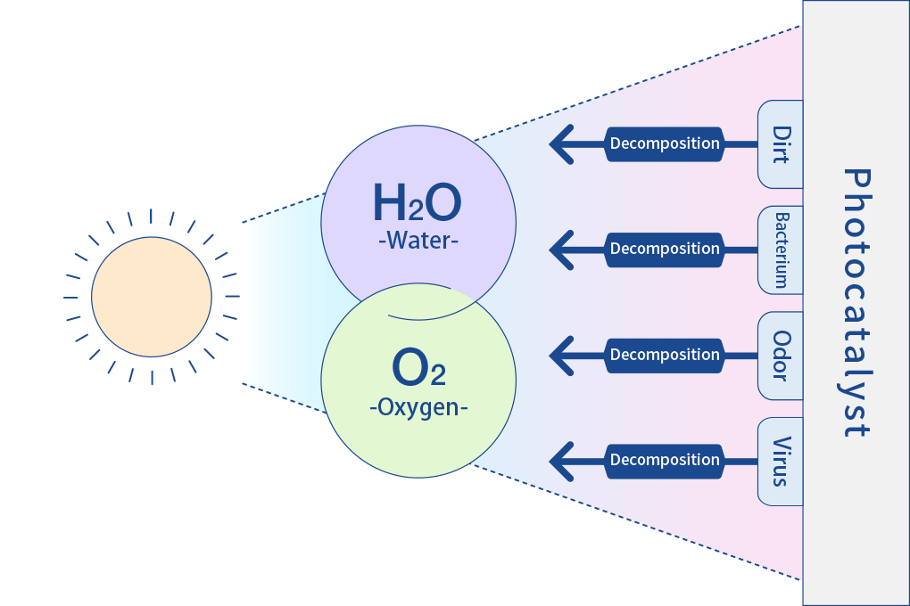 镀有典型光触媒材料氧化钛的表面会变得极易亲水,泼上水也会形成薄膜流走。另外氧化钛中的氧通过光照被去除,它与水分子反应形成羟基,使表面更亲水。因而可以洗去污垢,并长期保持自洁效果。