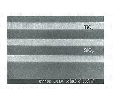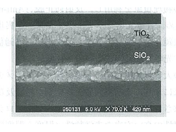 如图5.1所示,真空蒸镀是在真空容器中放入蒸发源和基片进行的。通常真空容器内排气到10-4Pa左右,在10-2〜10-4Pa的压力下成膜。这时平均自由行程为数10cm〜数10m左右,因此从蒸发源气化出来的薄膜物质到达基片时不会与残余气体发生碰撞。真空蒸镀中,蒸发粒子的能量为蒸发源温度相应的能量与基片加热产生的热能,约为0.1-0.3 eV左右。因此其具有对基片的损害小、薄膜中不易含有杂质等优点,但相对的,薄膜容易变得多孔,密度和折射率低,缺乏膜强度。在最佳条件下成膜的TiO2/SiO2复合膜横截面的SEM(扫描电子显微镜)图像如图5.2所示。
