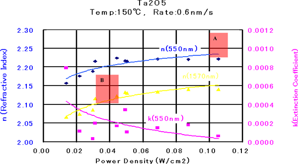 呈现功率密度越高,折射率越高,衰减系数越低的趋势。当功率密度超过0.05W/cm2时,折射率为大约2.22(@550nm)变得稳定。这时衰减系数在1×10-4左右。图6为在功率密度0.03W/cm2(A部分)和0.1W/cm2(B部分)条件下制备的Ta2O5单层薄膜的横截面SEM图像。B部分为柱状结构,与此相比,可以看出A部分是致密结构。 - TiO2