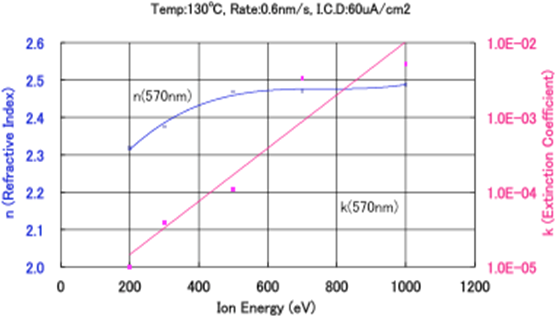 图5.7 IAD中TiO2薄膜的光学常数和离子能量的关系 2)