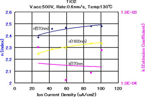 图5.8 IAD中TiO2薄膜的光学常数和离子电流密度的关系 2)