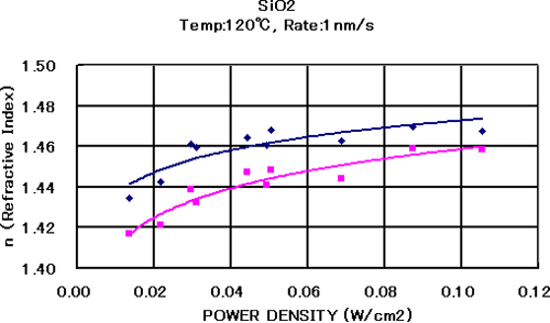 图5.7和5.8显示了在TiO2成膜中,将基片温度固定在130℃,成膜速率固定在0.6nm/s,加速电压与电流密度作为成膜参数独立变化时其与折射率和衰减系数的关系。如图7所示,当离子电流密度为60μA/cm2,加速电压为500V或更高时,折射率变为2.46~2.47。另一方面,如图5.8所示,当加速电压固定在500V,离子电流密度从30μA/cm2变为100μA/cm2时,薄膜的折射率随着离子电流密度的增加而增加。 - SiO2