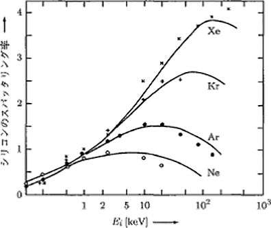 图5.13 Si的溅射率对入射能量与气体种类的依存度 9)