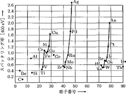 图5.14显示了能量为400eV的Ar+入射到各种靶材上时的溅射率9)11)。溅射率呈现周期性变化,Al、Cu、Ag和Au表现出最大值。反之,C、Ti、Zr和Ta等表现出低值。