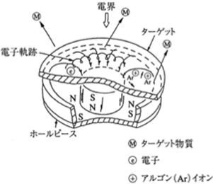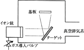 2.45GHz的微波与8.75×10-2T的磁场创造了电子回旋共振(Electron Cyclotron Resonance:ECR)条件,并发生强烈放电。在该等离子与基片之间放置靶,通过负偏压就会发生溅射,从而成膜。
