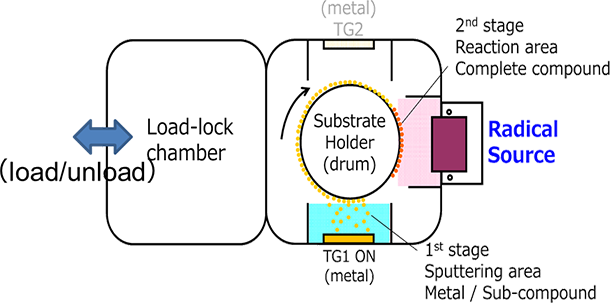 采用可以保持稳定阳极的Dual Cathode,反复进行对金属或金属的不完全氧化物进行成膜的成膜工艺以及利用强氧自由基源的完全氧化工艺,能高速且在低温条件下沉积高密度氧化物。RAS系统的概略图如5.21所示。RAS系统采用了预真空进样室系统来防止因基片搬入而导致的阴极氧化,确保了稳定的成膜工艺。
