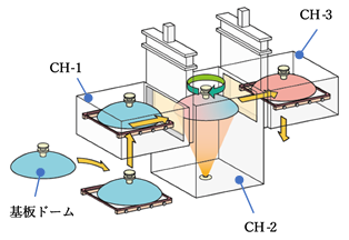 | CH-2: | 执行成膜工艺。 ・CH-2始终保持在高真空状态。 ・成膜材料按所需数量储存,并每次向成膜的各层进行供应。 |