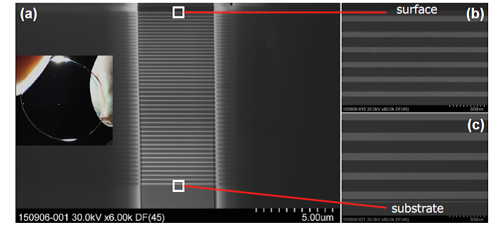 图9.4 TiO2/SiO2、282层、总膜厚33μm的超级多层膜的横截面SEM图像 2)