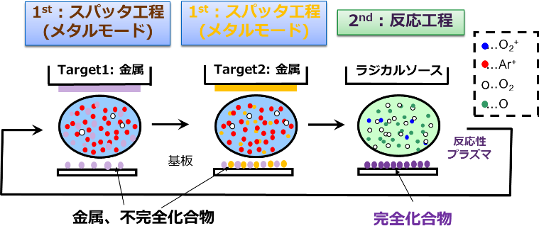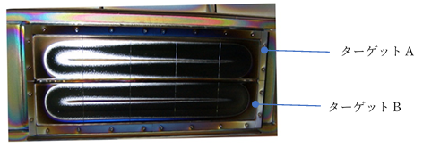 如图9.6所示,工艺室具备两组靶对。从而能够进行图9.11所示的混合膜的成膜工艺。通过选择各靶对的功率比,可以自由地获得复合金属的混合比。