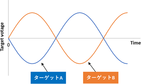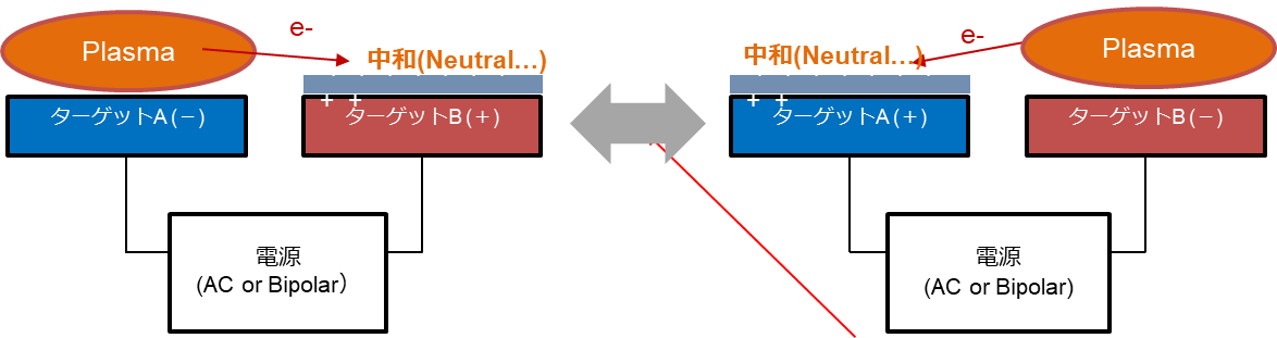 如图9.8所示,交替在靶A和B上施加高电压(40~100kHz),以半个周期为单位始终被施加在靶的正极或负极,在正极时沉积在靶表面的不完全氧化物在施加在负极时被溅射,始终确保干净的金属表面。另外,不完全氧化物所致的离子电荷引起的异常放电如图9.9所示为正极时,会被电子中和。