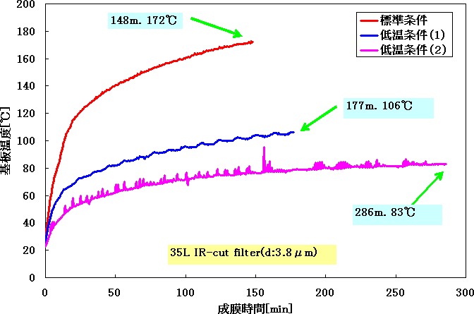 图9.10显示了RAS成膜过程中的基片温度变化。当进行总膜厚为3.8μm的IR截止滤光片的成膜时,标准成膜时间为148分钟,基片温度从室温上升到约170℃,但在低温成膜条件下,成膜时间增加,但基片温度下降到106℃、86℃。如果是这样的温度升高,也可以适用于树脂基片。