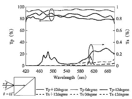 图9.13 利用中折射率制作的棱镜型PBS在0°和±12°入射角下的分光特性 3)