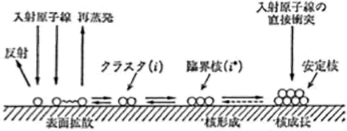 - 吸附原子在基片表面上扩散,在原子间的二维碰撞中形成团簇(Cluster),或在表面停留一定时间后重新蒸发。